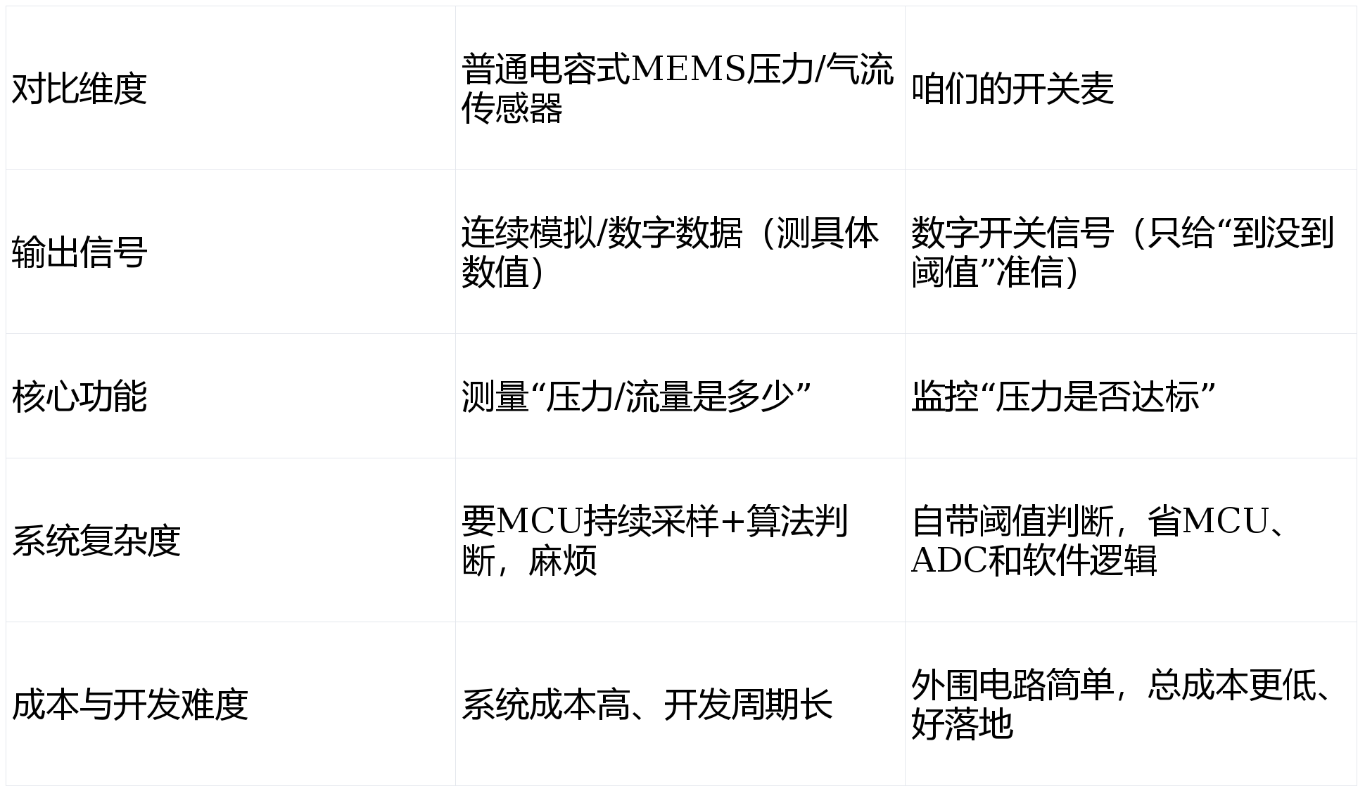 :用MEMS技术做的,靠气流压力差让微米级薄膜变形,改变它和固定电极之间的电容,内部ASIC会盯着压力变化,到了预设阈值直接输出开关信号(比如高低电平、通断),就给个“是/否”“开/关”的准信,不是输出连续的压力/流量值,简单直接!